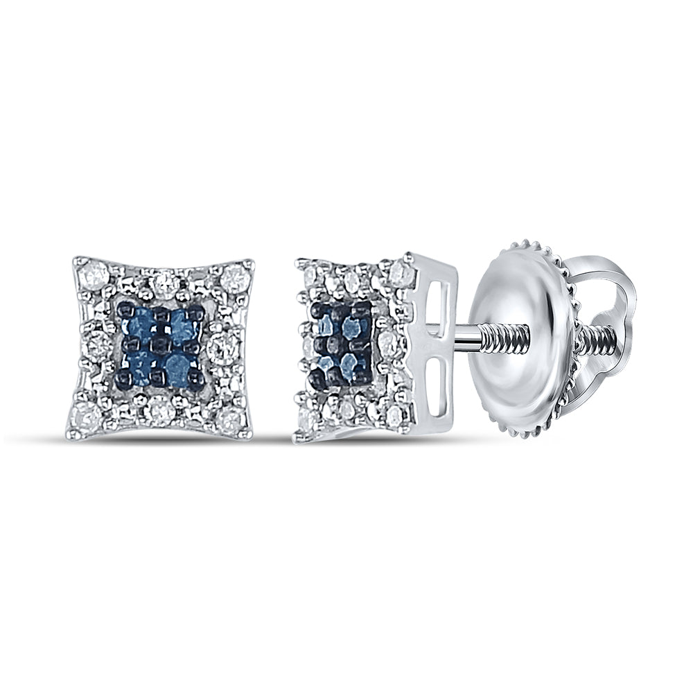 Sterling Silver Womens Round Blue Color Enhanced Diamond Square Cluster Screwback Earrings 1/10 Cttw