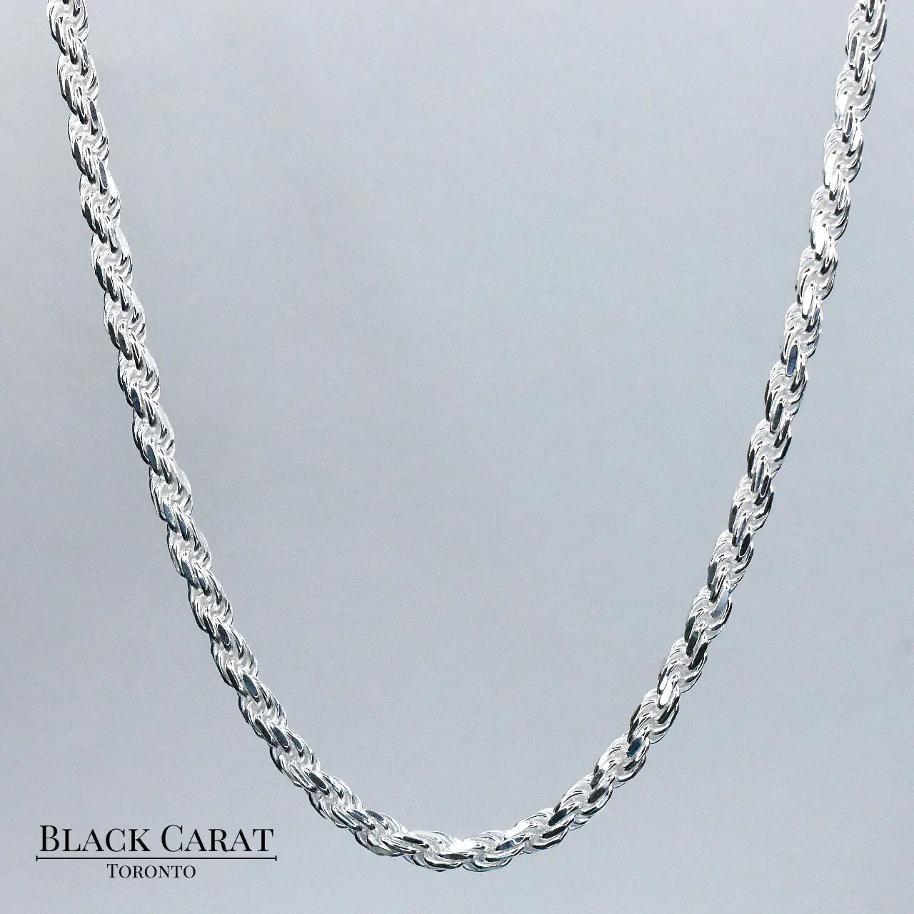 Our Rope chains are made from 925 sterling silver. What this means is that 92.5% of the chain is made from pure silver and the rest is made from another metal like copper. The reason why it has to be mixed is because the silver has to be hardened to make it durable. When it comes to silver this purity is the A grade. Our chains are also all handmade in Italy by talented professionals who have years of experience in crafting this chain. When you buy a Black Carat Rope Chain you are buying an item that is quality, durable and made by craftsmen that are passionate about their work.
